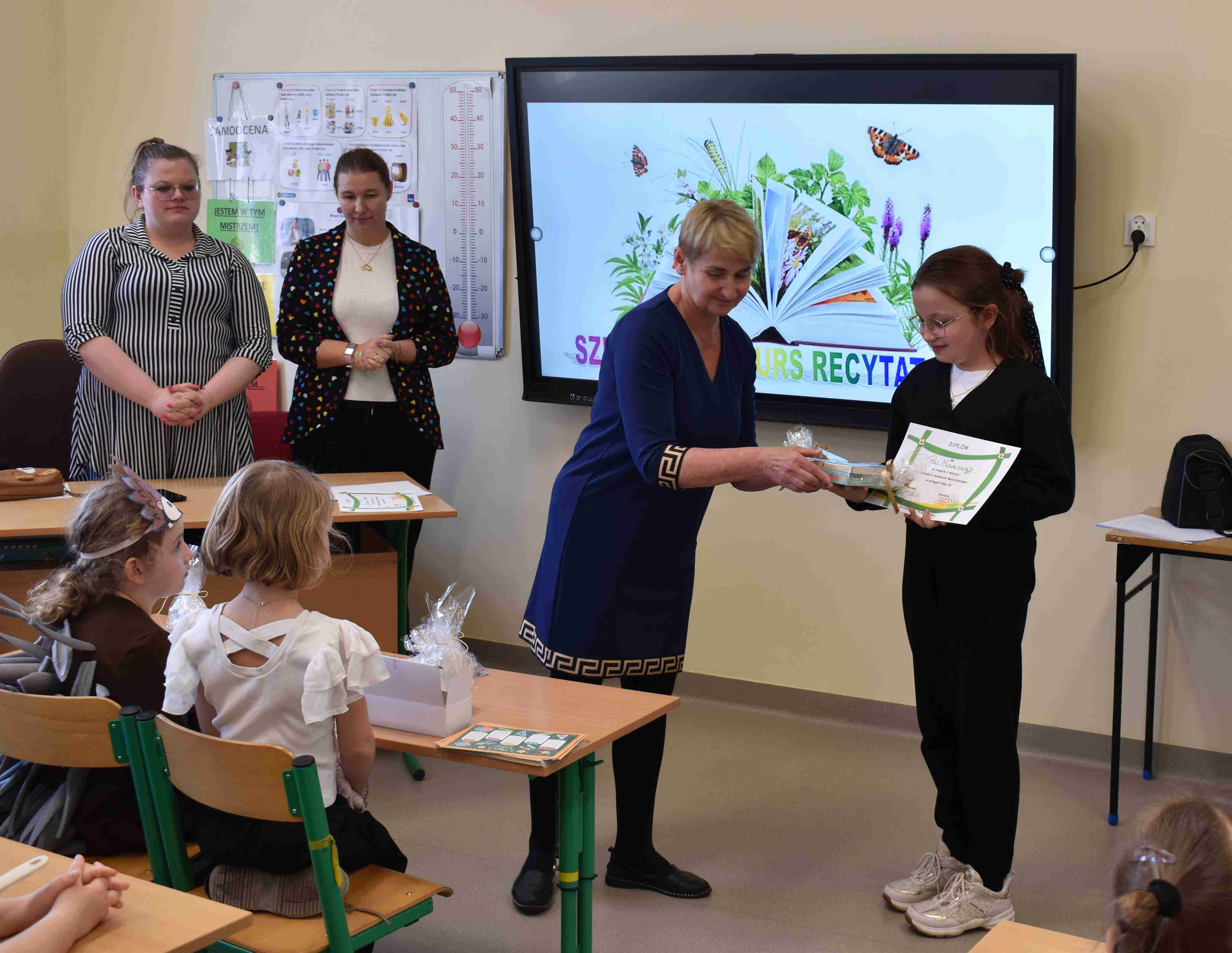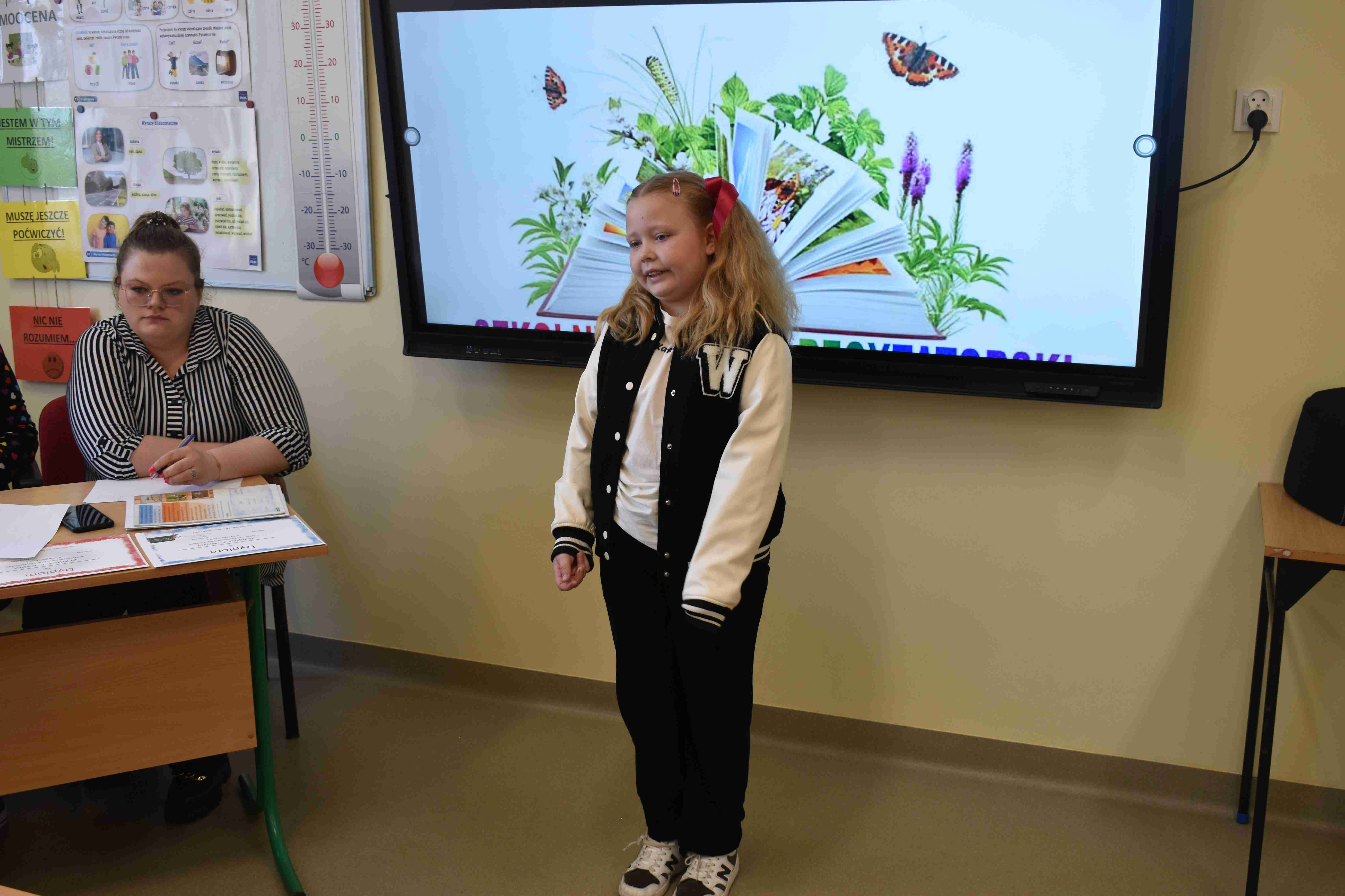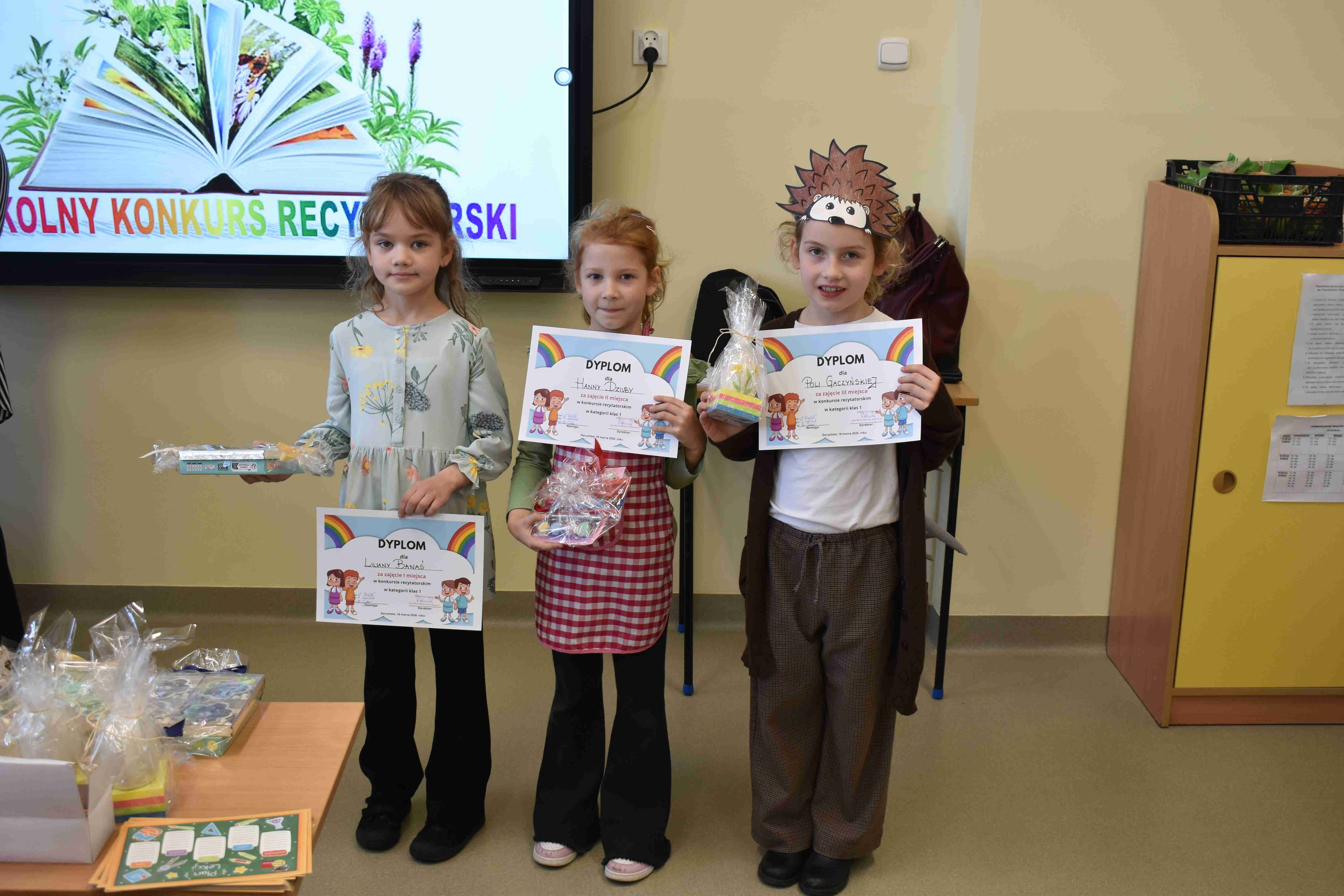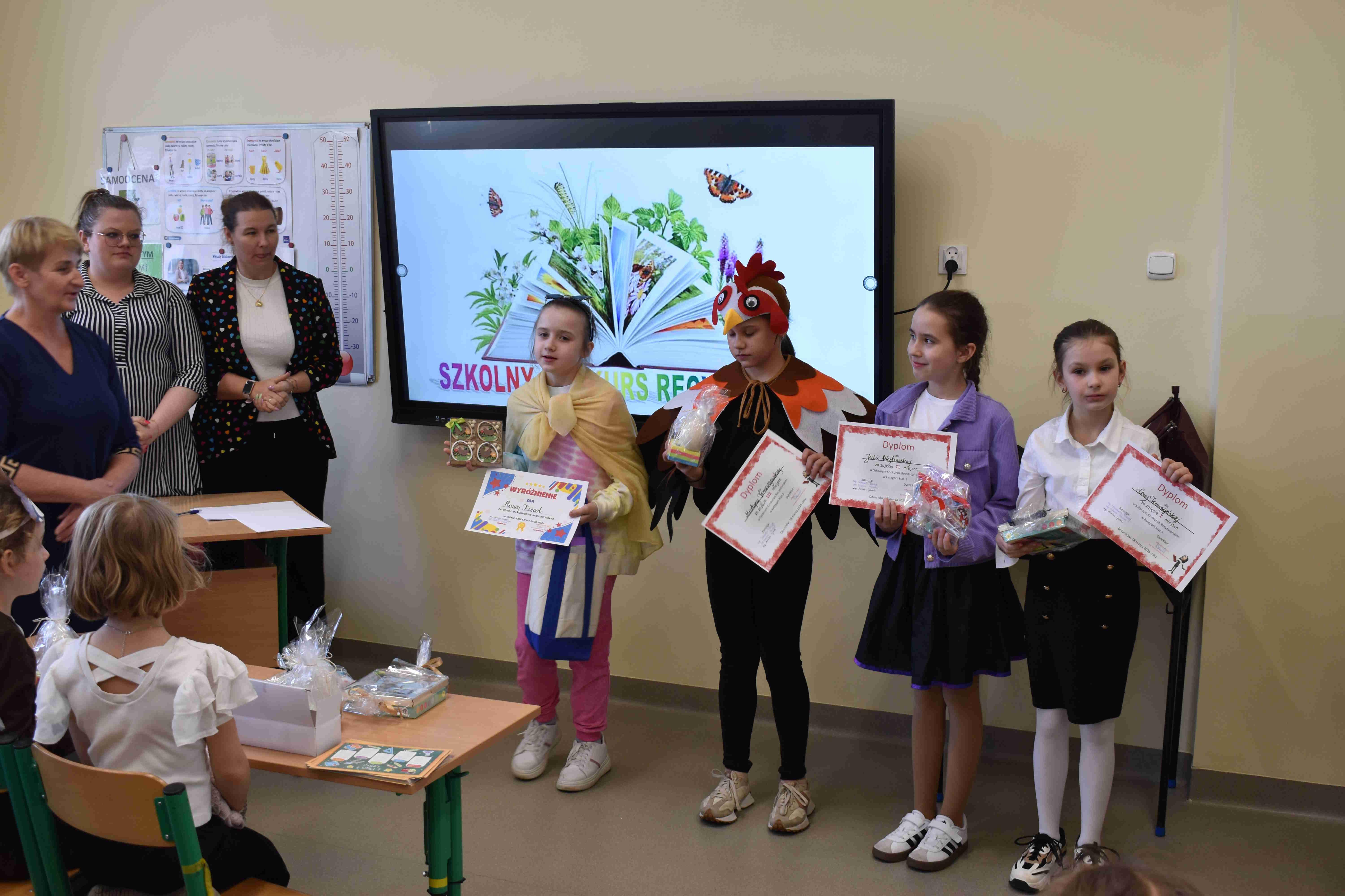 klas 1–4. Wydarzenie cieszyło się dużym zainteresowaniem – wzięło w nim udział wielu uczestników, którzy z ogromnym zaangażowaniem prezentowali wybrane przez siebie wiersze. Celem konkursu było rozwijanie zdolności recytatorskich, kształtowanie wrażliwości na piękno języka ojczystego oraz zachęcanie dzieci do wystąpień publicznych. Uczniowie zachwycili jury oraz publiczność swoją interpretacją utworów, dykcją oraz odwagą sceniczną. Wszyscy uczestnicy zasługują na ogromne brawa za włożony wysiłek i przygotowanie. Na zakończenie konkursu wręczono nagrody oraz dyplomy dla najlepszych recytatorów.