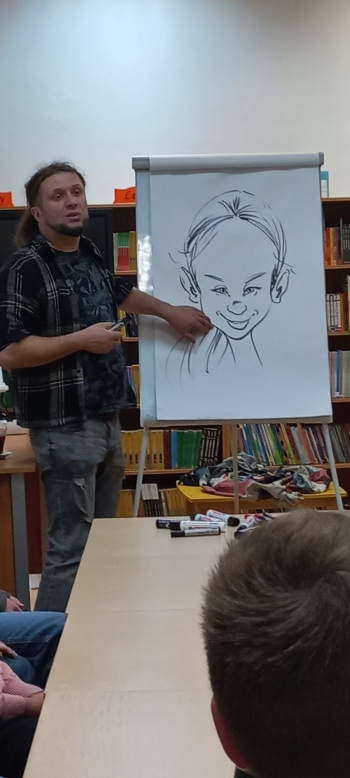 W piątek, 16 maja 2025 roku, wybrani uczniowie klas 5–7 wzięli udział w spotkaniu autorskim z rysownikiem i ilustratorem Szymonem Telukiem w Bibliotece Publicznej w Doruchowie. Opiekę nad uczniami sprawowała polonistka, bibliotekarka szkolna, pani Danuta Świtoń. Wydarzenie zostało zorganizowane w ramach Narodowego Programu Rozwoju Czytelnictwa w Ogólnopolskim Tygodniu Bibliotek. Artysta w ciekawy i przystępny sposób opowiadał o historii komiksu, jego języku oraz zasadach tworzenia – od pomysłu po gotową historię. Uczniowie z zainteresowaniem słuchali, jak należy czytać komiks, na co zwracać uwagę oraz jak budować napięcie w opowieści. Druga część spotkania miała charakter warsztatowy – każdy z uczestników mógł stworzyć własną komiksową historię. Szczególnym zainteresowaniem cieszyło się rysowanie karykatur, które artysta wykonywał na żywo, wzbudzając wśród uczniów wiele emocji i radości. Spotkanie przebiegło w przyjaznej, twórczej i pełnej pozytywnej energii atmosferze, a uczniowie zapamiętają je, jako wyjątkowe i inspirujące doświadczenie.