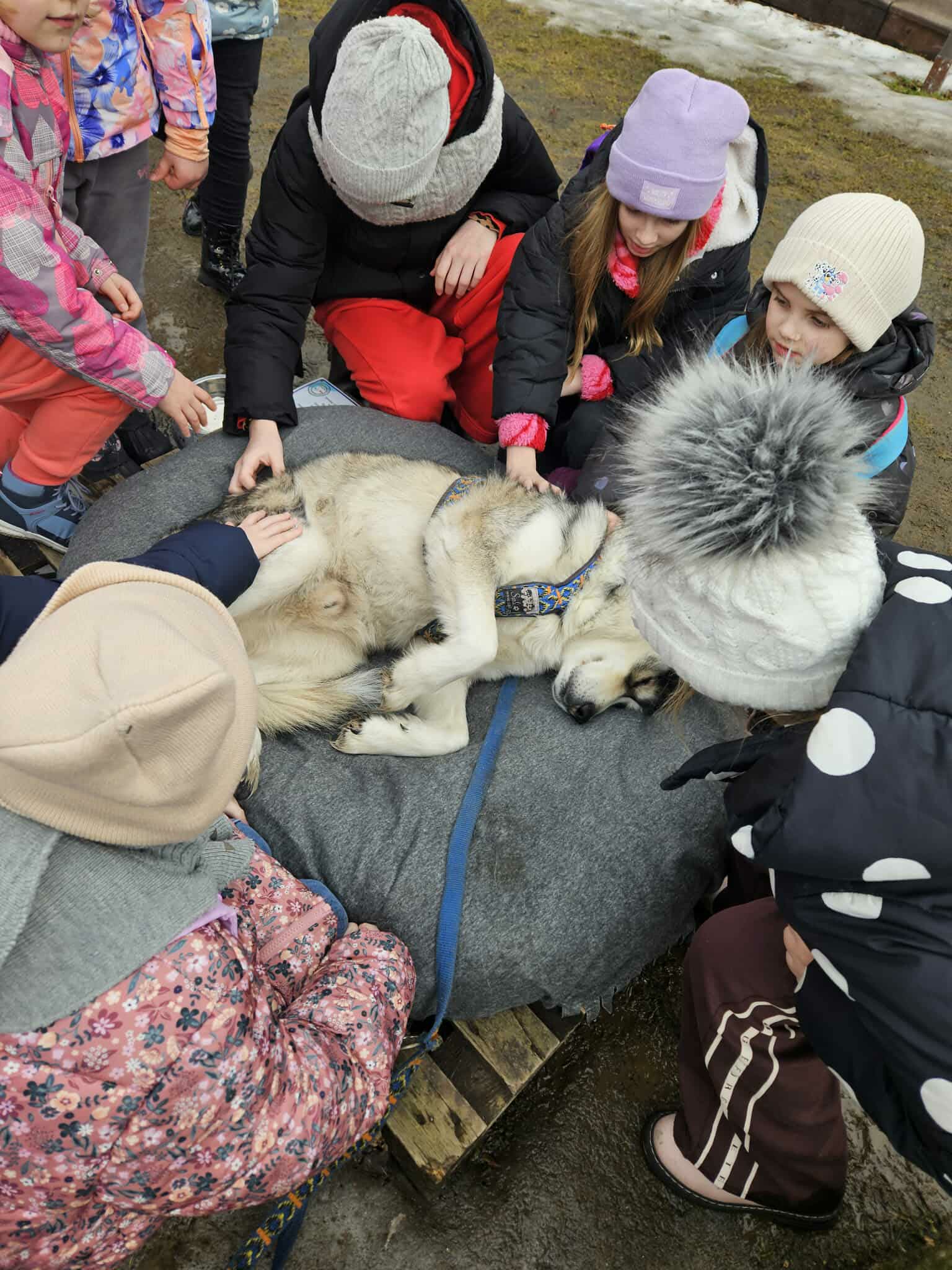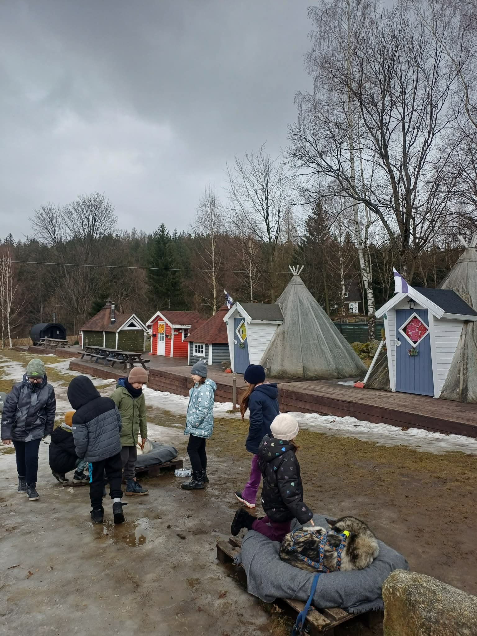 Zwieńczeniem zajęć był poczęstunek w jednym z namiotów – aromatyczne kakao muminkowe oraz słodka chałka, które smakowały wyjątkowo w bajkowej scenerii fińskiej osady. Następnie uczniowie mieli możliwość wspólnej zabawy z psami husky, a także spaceru w ich towarzystwie po pięknych karkonoskich krajobrazach. Dla wielu dzieci była to niezapomniana atrakcja.